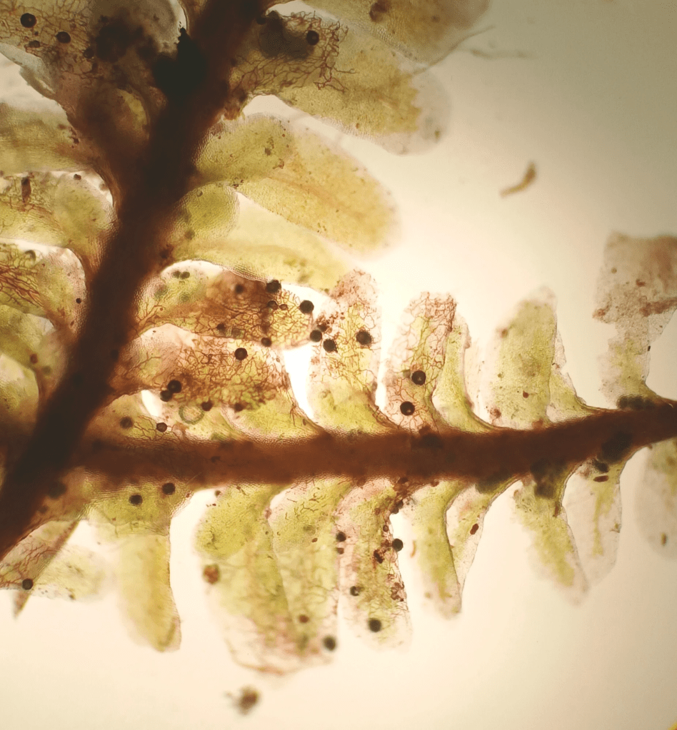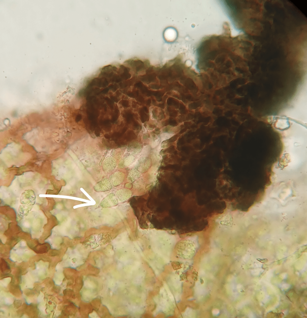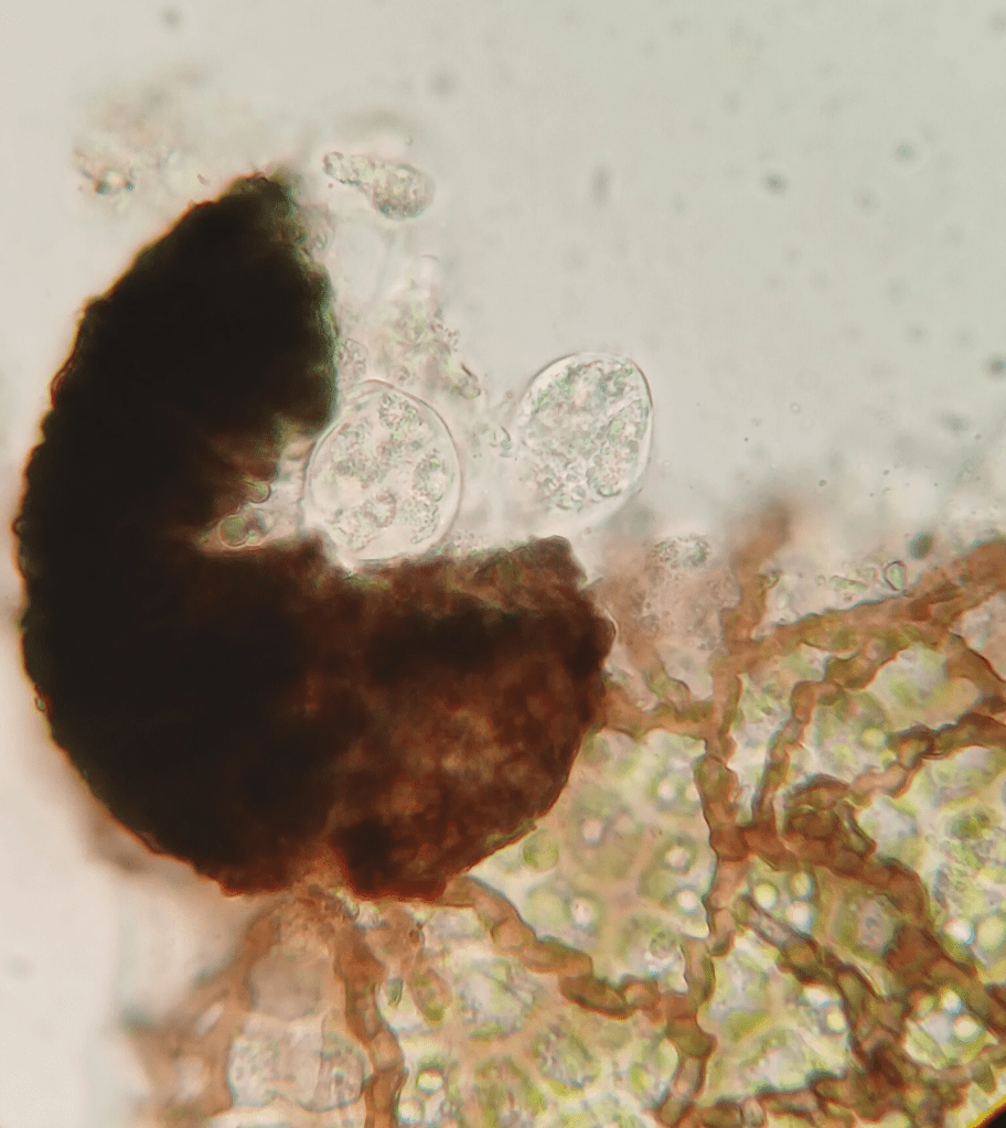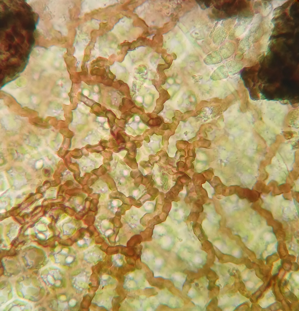Habitat photos of Welsh collection from near Melincourt Waterfall in April 2026.Infected shoots of the above.Two shoots of the liverwort, Diplophyllum albicans, under the compound microscope at around x100 total magnification. They have dark reddish-brown stems and green leaves. There are small, black spots on some of the leaves along with tiny open networks of brown, anastomosing hyphae.A ruptured black-brown fruitbody of Bryobroma caudatum with two hyaline, globose immature asci emerging from it. The fruitbody is sitting on a fragment of leaf tissue with mycelium on top of it. Image at x1000 magnification.Some ellipsoidal, hyaline ascospores beside a ruptured fruitbody of the fungus. One with a tail-like appendage is indicated by an arrowThe mycelium of B. caudatum and related species is formed of conspicuous brown hyphae that mostly grow on top of the anticlines of the host cells, occasionally forming tiny pin haustoria that penetrate the cell walls (not easily visible unless sections are made). The host cells cytoplasm is intact and the underlying cells are living, with chloroplasts and oil bodies. Image at x1000 magnification.