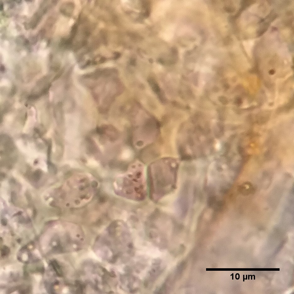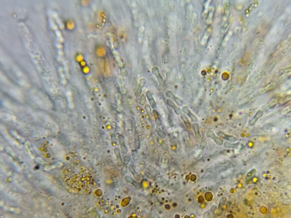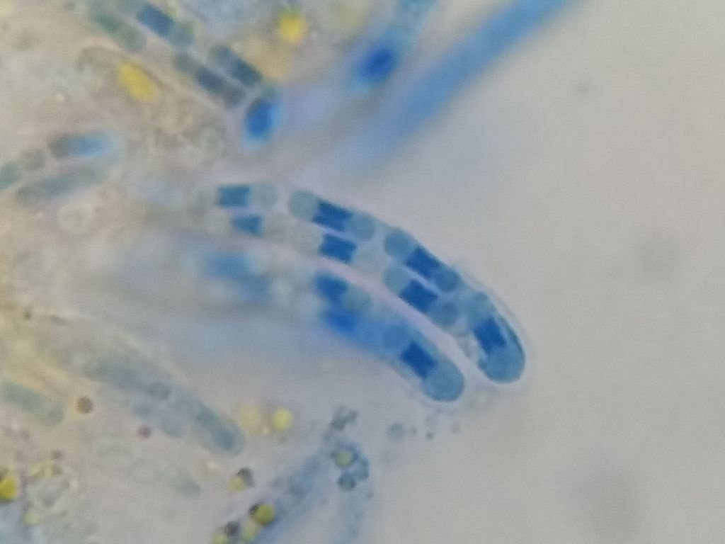 The ascospores are dumbbell-shaped and 1-septate, about 6-8μm long and 2-2.5μm wide. The septa, however, are frequently obscured by a distinctive, thickened structure in the medial domains of the spores (see images below). This band stains strongly in lactophenol cotton blue, so is therefore termed cyanophilous, and the variation in these bands is useful for separating species in the genus Bryocentria. Rupturing the fruitbodies of this fungus also releases of globules of orange pigment into the mounting medium. I have not noticed these in B. hypothallina and B. metzgeriae, only in this species and B. octosporelloides.