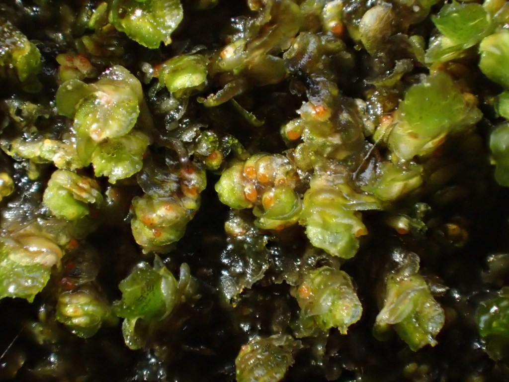 Trentepohlia algae frequently grow on bryophytes, looking somewhat like a rust fungus, especially on Frullania. These hairy orange balls may resemble Octosporella spp., and I have been foxed by spherical colonies of Trentepohlia a number of times. Close examination shows a lack of a fruitbody. Microscopically, the alga is made up of pigmented, thickened, filamentous cells. I should also mention that Trentepohlia is incredibly common, perhaps more so than any fungus on Frullania.