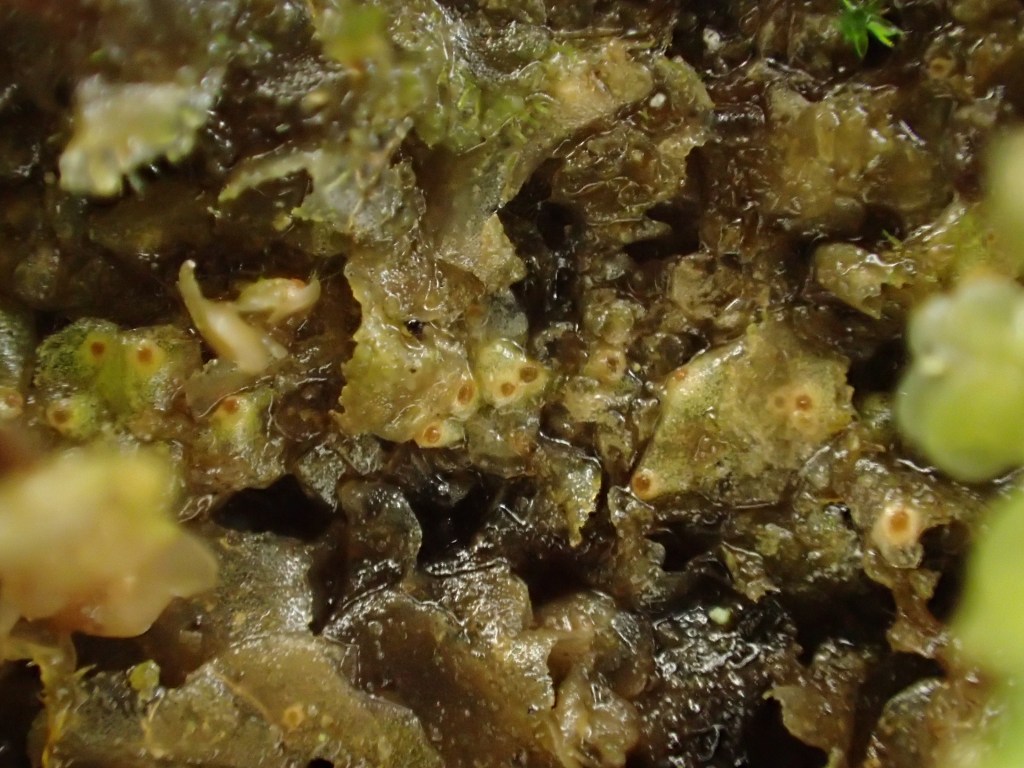 The perithecia are visible as orange spots under a hand lens in the field, these spots measuring between 1/5-1/4 of a millimetre in width. In the English specimen on Radula complanata, the perithecia were found on thalli below healthy-looking perianths, with the infected areas bleaching.