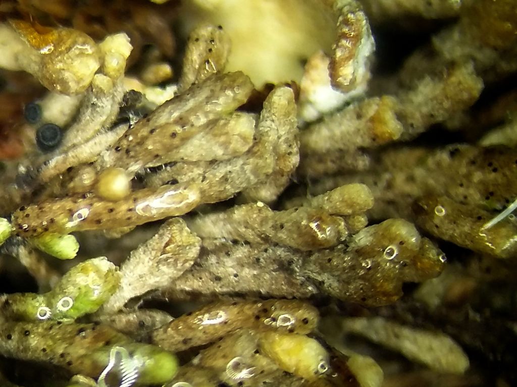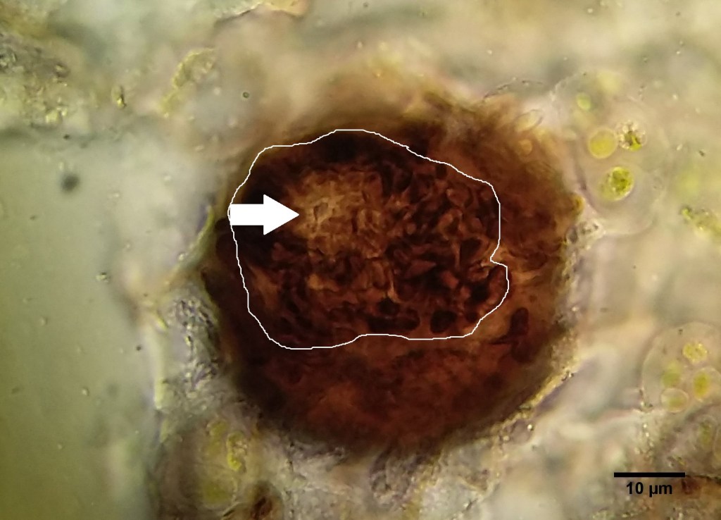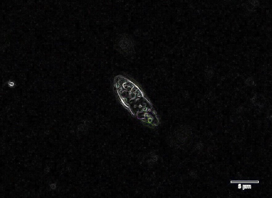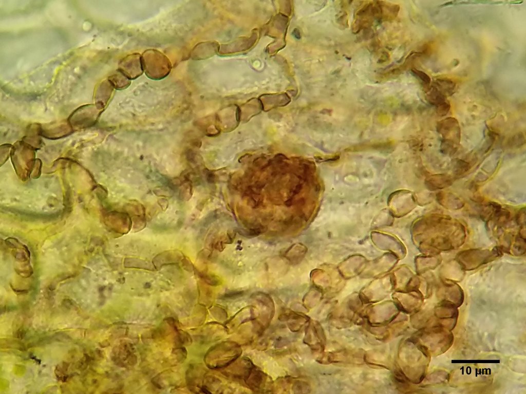 Several dozen fruitbodies on G. obtusum, on lower regions and not the growing green apices. 5-month-old herbarium material (dry) photographed under the dissecting microscope. Merioneth, VC48, Sept 2021Fruitbodies on Gymnomitrion obtusum shoots under dissecting microscope. Merioneth, VC48, Sept 2021A mature fruitbody in water. The pale spot at the top is dissolving cells giving way for the ostiole (tube), which will let the spores disperse. Note the thickened, protruding stubby cells around the neck of the fruitbody. These likely help with additional protection against water loss. Leg., McLennan, C., Cumbria, VC70, March 2022.As per previous annotation. Ostiole (arrowed) and stubby neck cell layer outlined.Brown vegetative hyphae and a fruitbody in water. Leg., McLennan, C., Cumbria, VC70, March 2022.Liberated ascospore in water. Leg., McLennan, C., Cumbria, VC70, March 2022.The above image manipulated using the “find edges” function in imageJ. This highlights the fusiform (spindle) shape of the spore and shows that the two cells are unequal. Young fruitbody primordia forming along hyphal strands. Leg., McLennan, C., Cumbria, VC70, March 2022.Older developing fruitbody compared to the above. Note that the ostiole is already specified for development very early, marked by the paler colour and little hole in the centre. Leg., McLennan, C., Cumbria, VC70, March 2022.