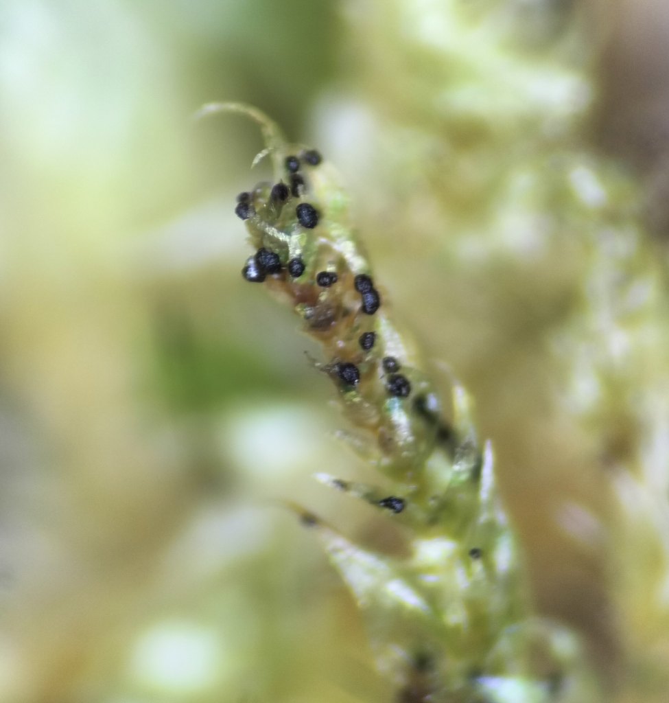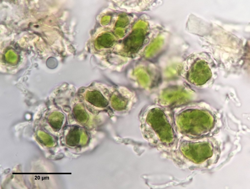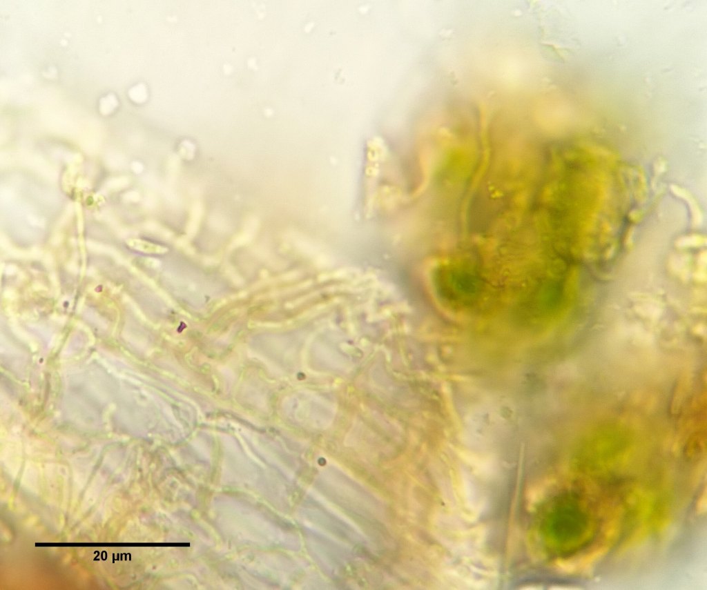 Ascomata on Hypnum cupressiforme. Leg. Caz Walker & Chris Cant, Nov 2022.Asci and ascospores of the above in IKI.Hyphae of the lichen on host leaves.Green algal photobiont cells.