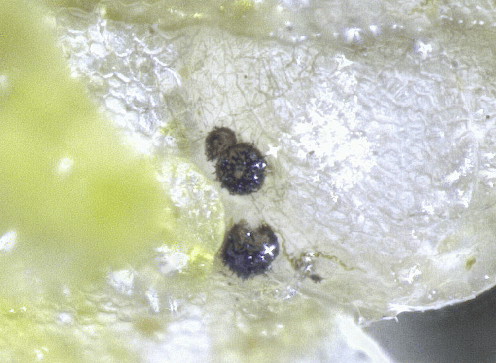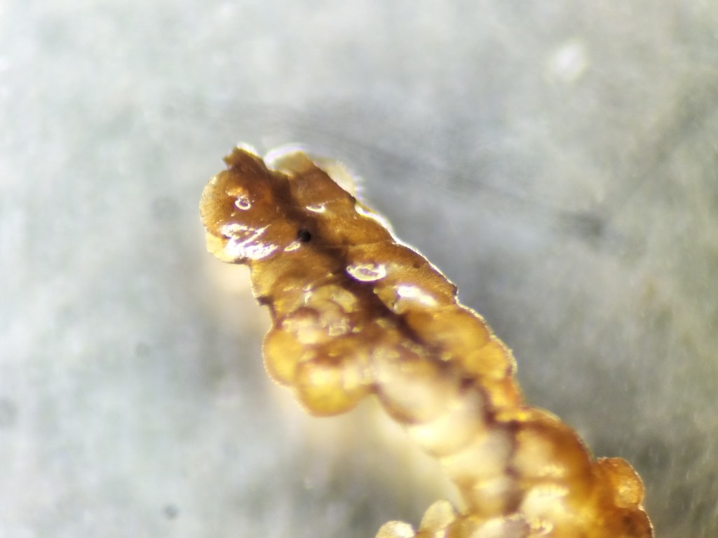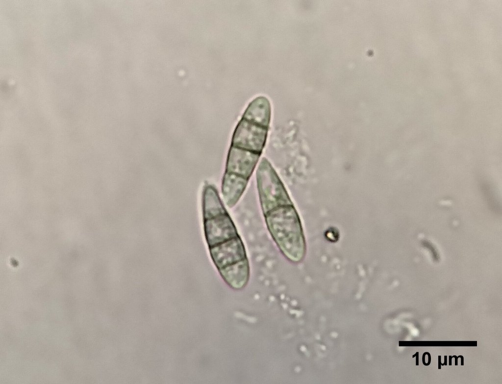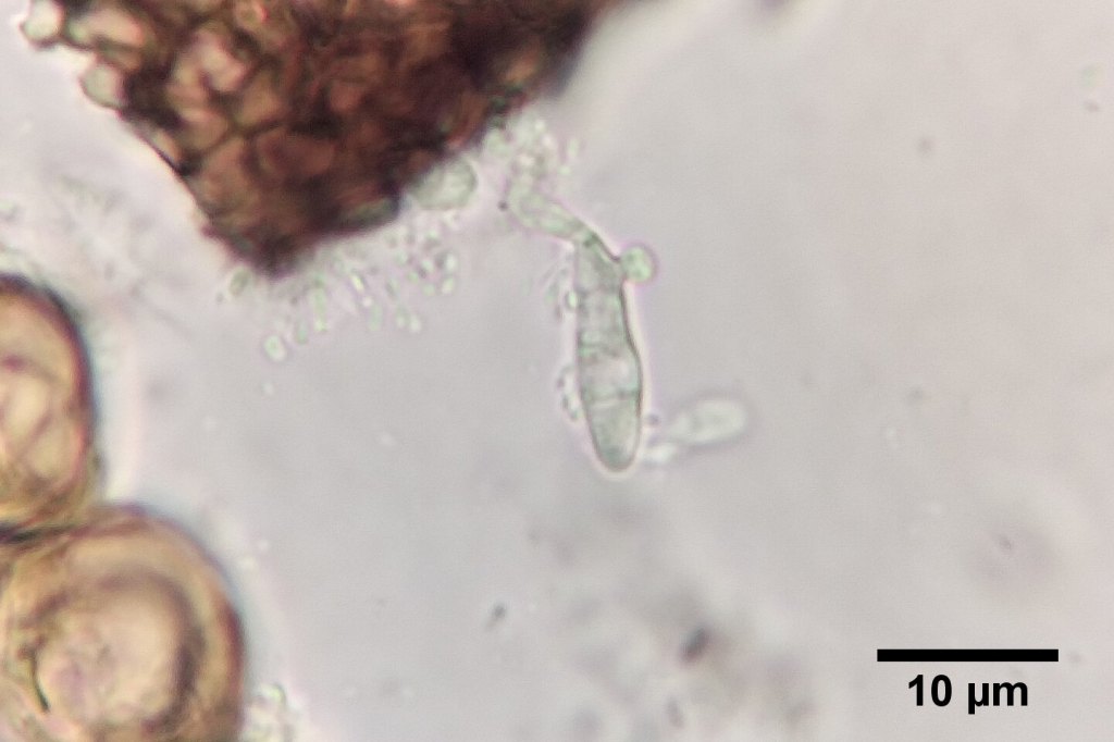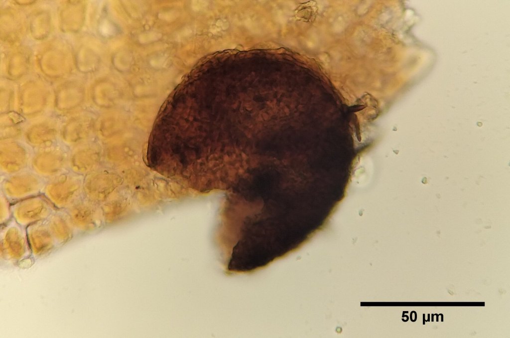 Pale necrotic patch on tree. Near Monmouth, Feb 2025Close-up of frontier of necrotic ring.Tiny black ascomata on host plants in situ. Near Monmouth, Feb 2025Epibryon hepaticicola ascomata mostly along the margins of bleached Metzgeria furcata.Three ascomata on M. furcata, with dense apical spines.Typical ascoma localisation on the ventral thallus margins. On M. furcata.Setose ascomata of E. hepaticicolas.str. on decaying Metzgeria furcata (Isle of Wight, VC10). Mid-Nov 2022.Ascospores of the above collection in water.Black ascoma between host leaves under stereomicroscope. Leg. S. Bosanquet, Det. P. Doebbeler. Wales, VC45, Lawrenny Wood, Apr 2008.Black ascoma between host leaves under stereomicroscope. Leg. S. Bosanquet, Det. P. Doebbeler. Wales, VC45, Lawrenny Wood, Apr 2008.Ascoma in water. Leg. S. Bosanquet, Det. P. Doebbeler. Wales, VC45, Lawrenny Wood, Apr 2008.Germinating ascospore in water. Leg. S. Bosanquet, Det. P. Doebbeler. Wales, VC45, Lawrenny Wood, Apr 2008.