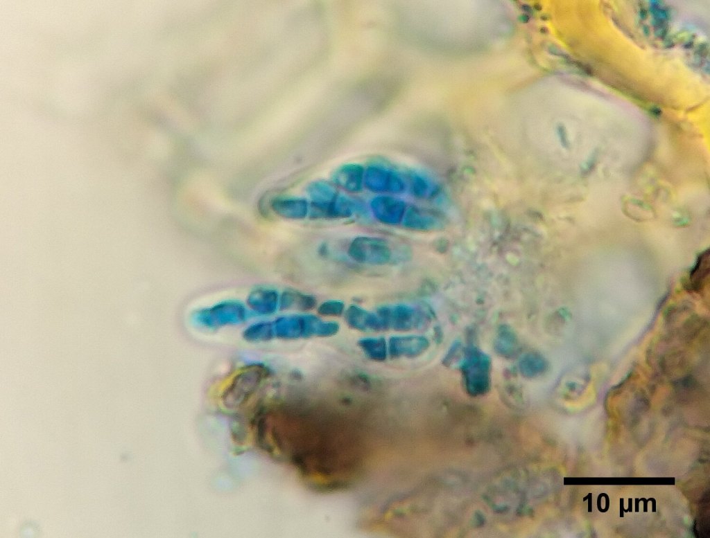 Infected leaf of P. urnigerum with dozens of ascomata. Scotland, Cairn Gorm, July 2019.Ascomata immersed between host leaf lamellae with necks protruding. Scotland, Cairn Gorm, July 2019.Optical section through ascoma in IKI showing ascus and 1-septate spores. Scotland, Cairn Gorm, July 2019.Asci and spores in lactophenol cotton blue. Scotland, Cairn Gorm, July 2019.