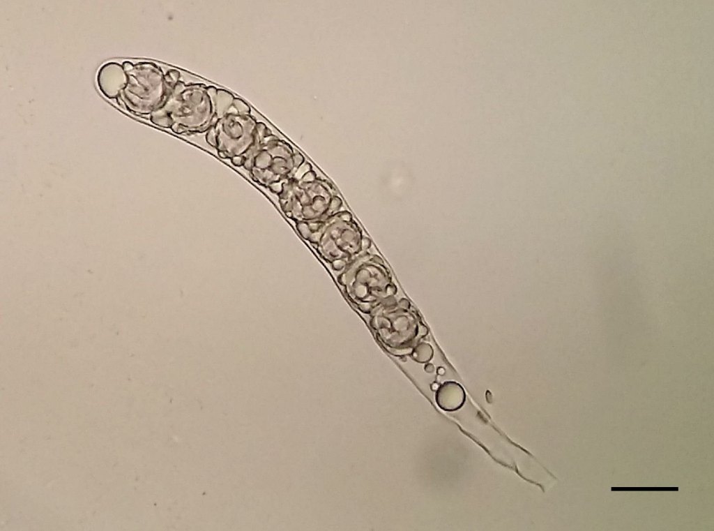 Apothecium on Pleuridium sp. from a root plate in woodland. Firestone Copse, Havenstreet, VC10, 2018Ascus in water. Bar = 20 microns. Firestone Copse, Havenstreet, VC10, 2018