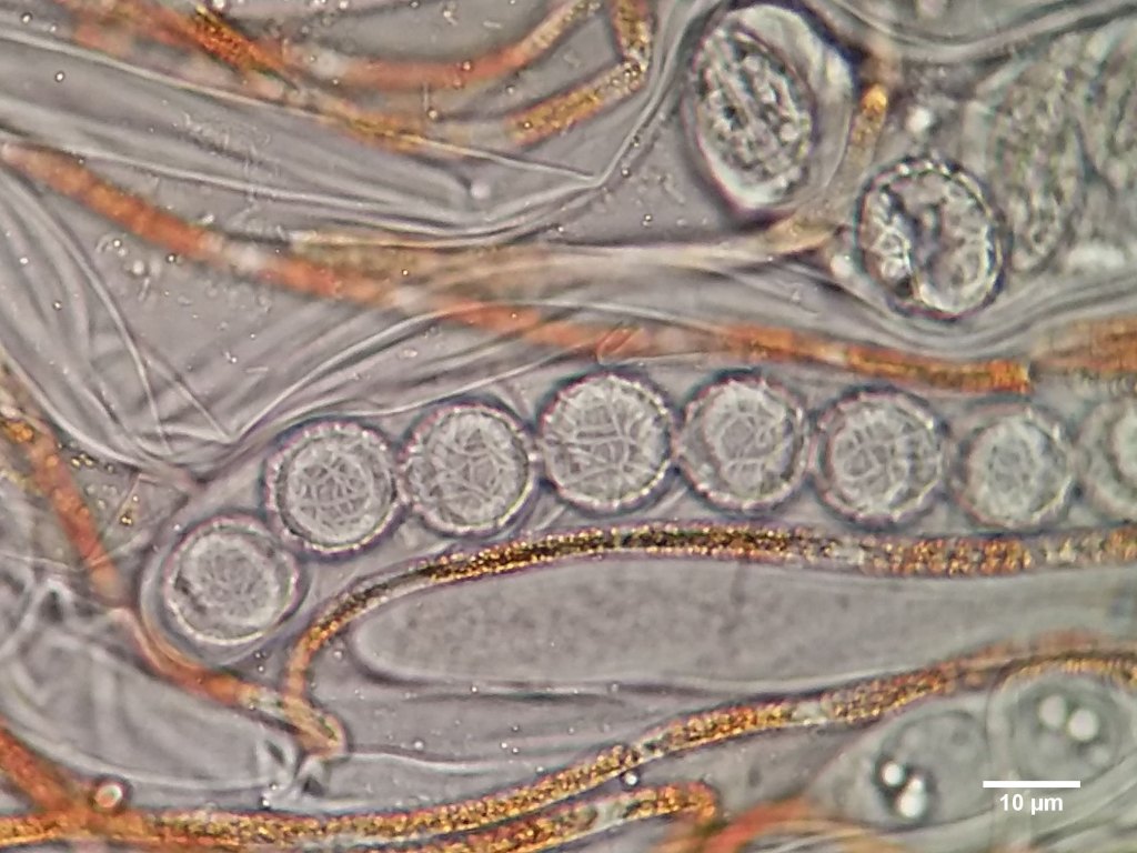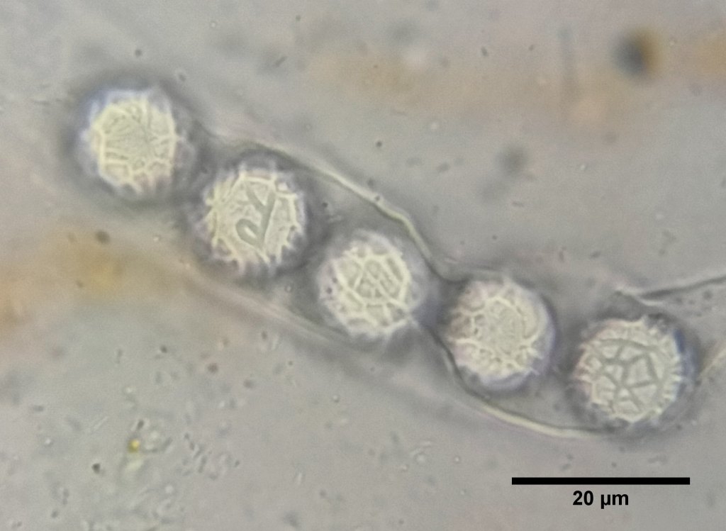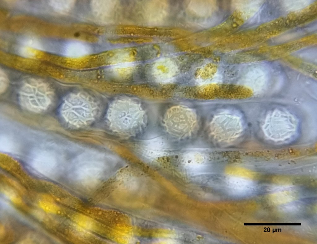 A group of apothecia with Aloina aloides. Bonchurch Landslip, VC10, 2021Young and older apothecia. Bonchurch Landslip, VC10, 2021Ascospores in ascus showing curved lines of the epispore ornamentation (1000X). Bonchurch Landslip, VC10, 2021