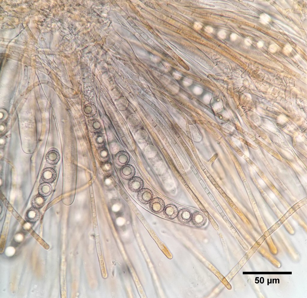 Infected material showing apothecial development. Leg. J. Warren, Mar 2023. Wales.Mature apothecium. Leg. J. Warren, Mar 2023. Wales.Asci and paraphyses in water. Leg. J. Warren, Mar 2023. Wales.Asci in water. Leg. J. Warren, Mar 2023. Wales.Asci and spores in cotton blue in lactic acid. Leg. J. Warren, Mar 2023. Wales.