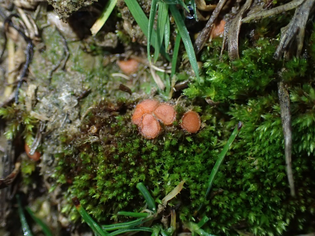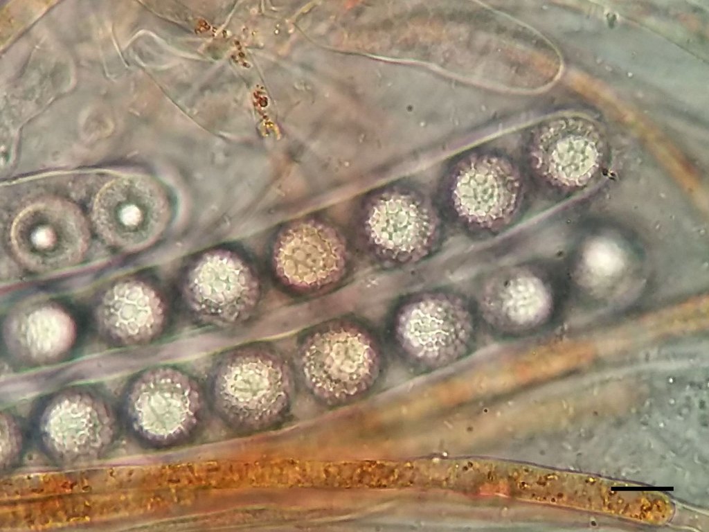 A group of apothecia beside host patches (Bryum argenteum,Bryum s.l., and some Acaulon muticum mixed together)A single apotheciumSpore ornamentation. Bar = 10 microns