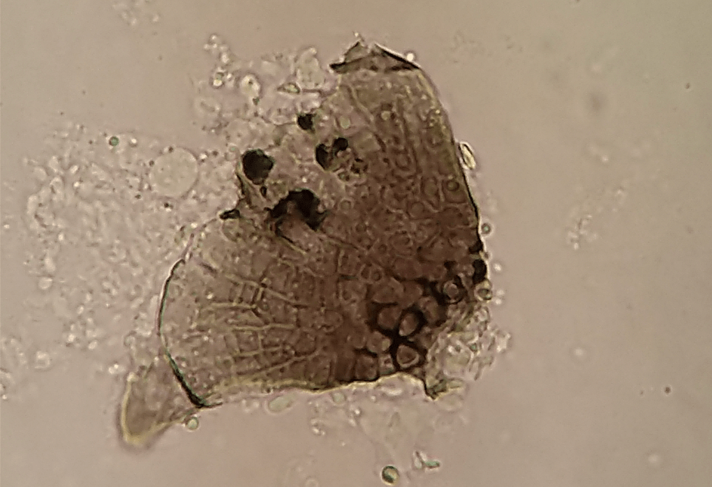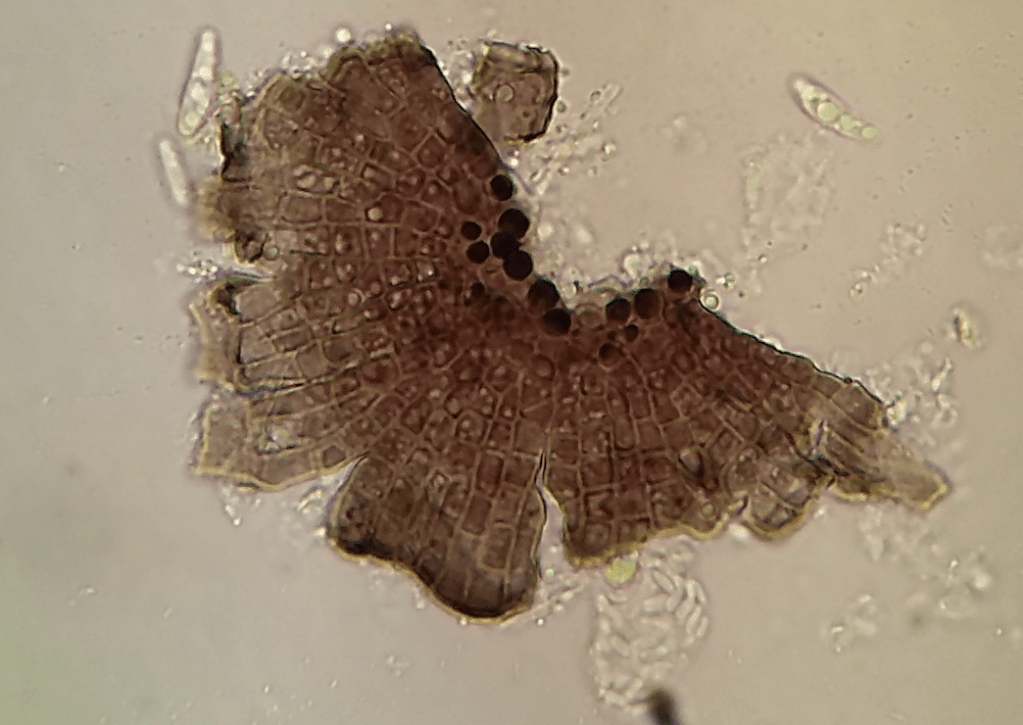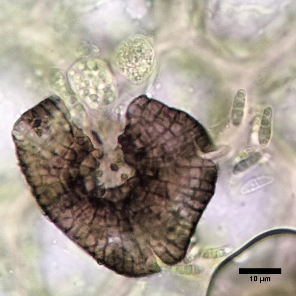 Minute thyriothecia on Plagiochila asplenioides leaf under the dissecting microscope. Merionethshire, VC48, Sept 2021Thyriothecia with thickened cells at the ostiolar collar and a whitish mycelium surrounding. Host: P. asplenioides. Merionethshire, VC48, Sept 2021Ascospores in water (1000X, cropped). Host: P. asplenioides. Merionethshire, VC48, Sept 2021Top view of thyriothecium in water. Host: P. asplenioides. Merionethshire, VC48, Sept 2021Side view of thyriothecium in water. Host: P. asplenioides. Merionethshire, VC48, Sept 2021Thyriothecium section from Polytrichum commune – on cuticle of abaxial (outward-facing) sides of old antheridial cups. Merionethshire, VC48, Sept 2021A squashed tyriothecium on Plagiochila asplenioides. Midger Wood, England, VC33, Oct 2022.