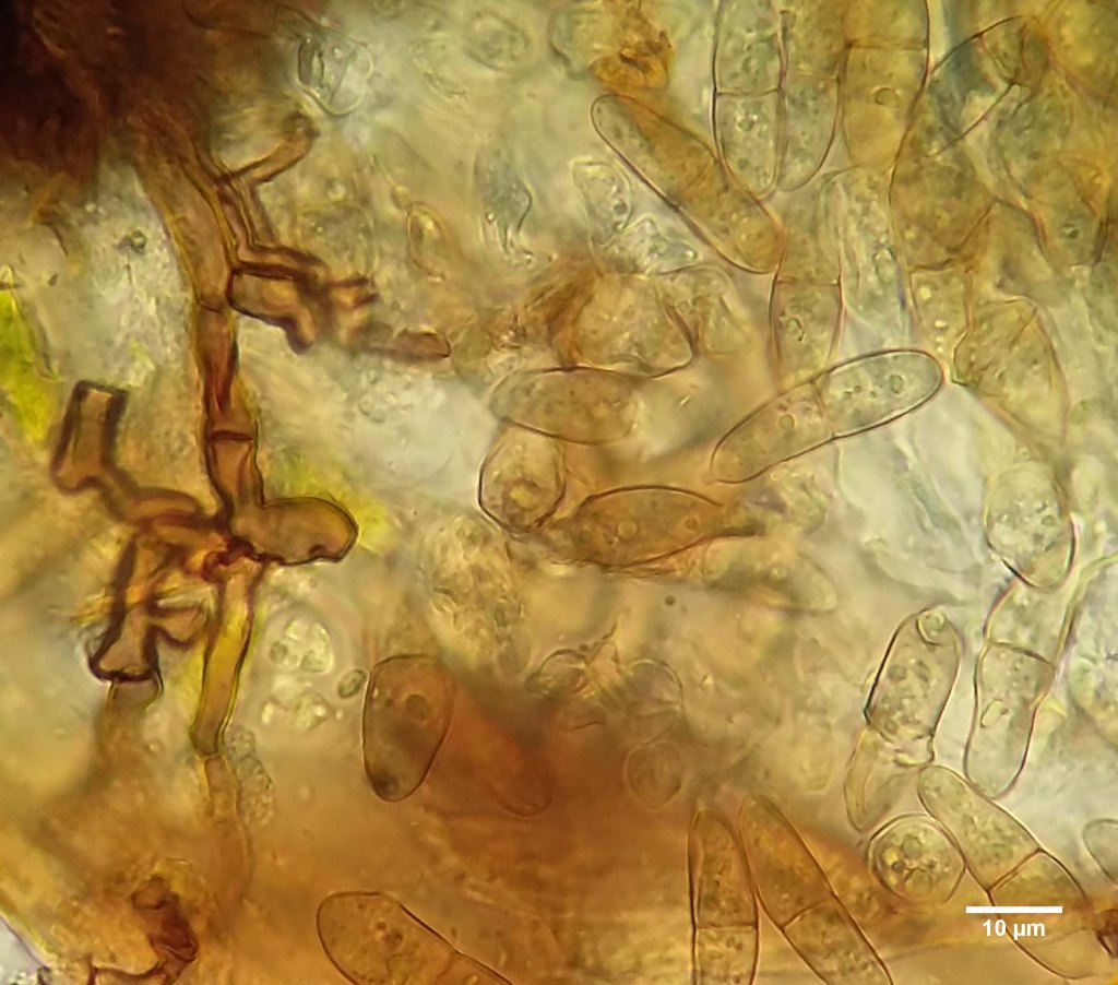 Infected host antheridial cups. Mount Cairn Gorm, Marquis Well. July 2019. Infected host antheridial cups. Mount Cairn Gorm, Marquis Well. July 2019.Peridium cells textura angularis. Mount Cairn Gorm, Marquis Well. July 2019.Hyphae (left) and ascospores of rehydrated herbarium material of the above in April 2022. Mount Cairn Gorm, Marquis Well. July 2019.Germinating ascospore of rehydrated herbarium material of the above in April 2022. Mount Cairn Gorm, Marquis Well. July 2019.Ascospore of rehydrated herbarium material of the above in April 2022. Mount Cairn Gorm, Marquis Well. July 2019.