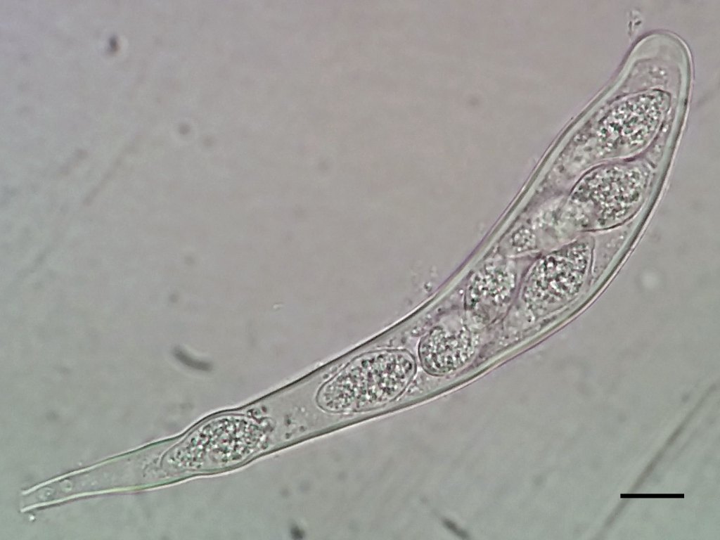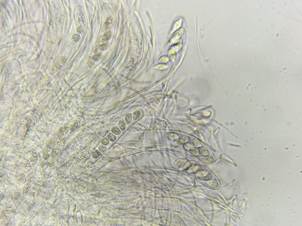 Parasitic on Ptychostomum (Bryum) capillare. Martin’s Wood, VC10, Jan 2021Ascus in water. Bar = 10 microns. Martin’s Wood, VC10, Jan 2021Apothecia beside Ceratodon purpureus, Bryum sp., etc. on acid soil. Headon Warren, VC10, Dec 2021Asci, hyaline paraphyses and fusiform ascospores in water (400X). Material from Headon Warren, VC10, Dec 2021.