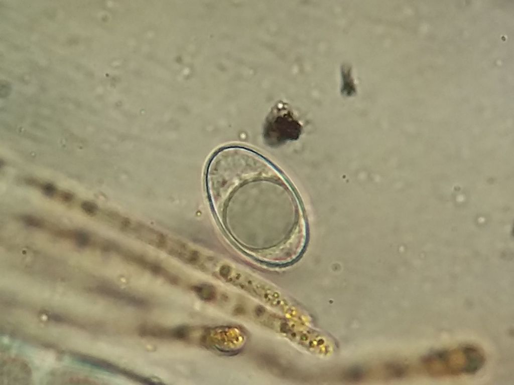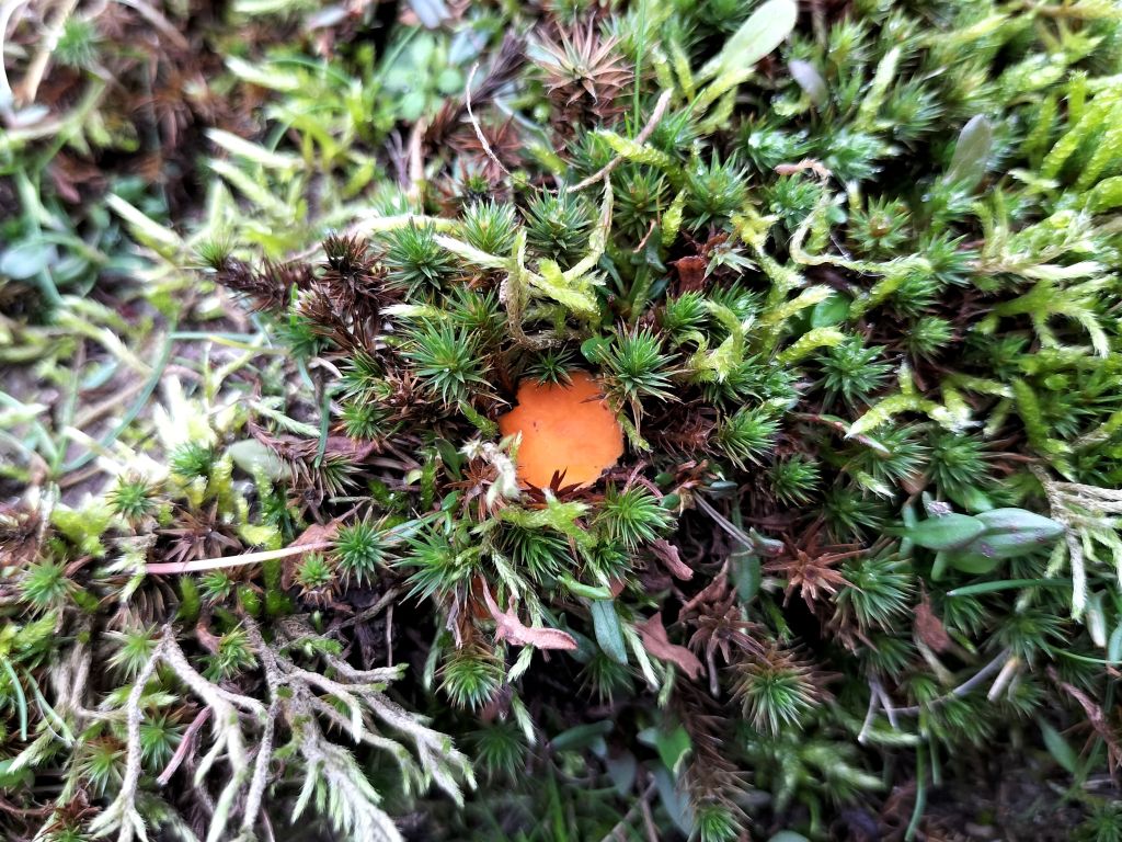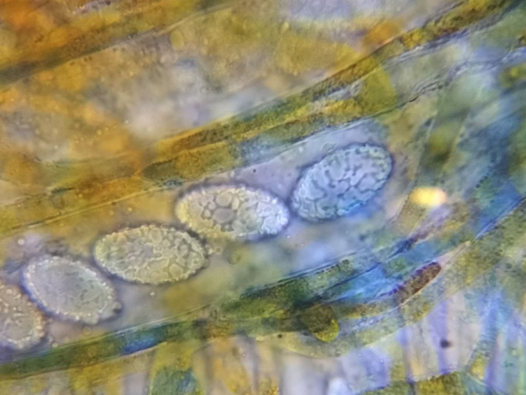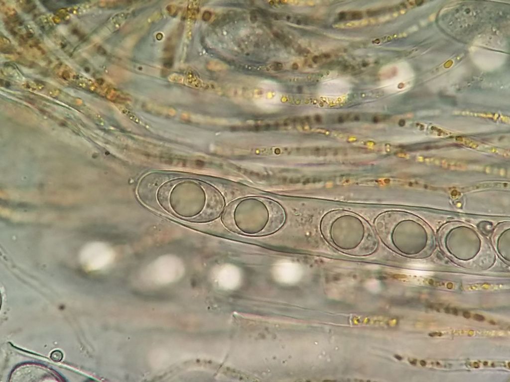 Apothecium within a patch of Polytrichum juniperinum. Ventnor Down, VC10, Jan 2022Apothecia among host shoots. Leg. et det. J. Norton. Photo: kindly provided by J. Norton. VC11, Nov 2021Apothecium among host shoots. Leg. et det. J. Norton. Photo: kindly provided by J. Norton. VC11, Nov 20Ascus with immature in water at 1000X. Material collected by A. Platt Nov 2021Ascospore (not fully mature) in water at 1000X. Material collected by A. Platt Nov 2021Ascospores stained in lactophenol cotton blue under oil immersion lens. Note the reticulate ornamentation of the spores. Material from Ventnor Down, VC10, Jan 2022.Asci containing immature ascospores from the same apothecium as above (Ventnor Down, VC10, Jan 2022). The dintinctive reticulate ornamentation has not yet developed, so these spores appear to have punctate ornamentation like the closely related N. vivda. It is therefore recommended that multiple ascospores are checked, especially mature ones liberated from the asci, to avoid confusion. N. vivida grows on Polytrichum piliferum and apparently not P. juniperinum, with N. rutilans on P. juniperinum and not P. piliferum. But both are able to infect other Polytrichaceae.Habitat shot of Ventnor Down material (Jan 2022) with host on disturbed soil bank.