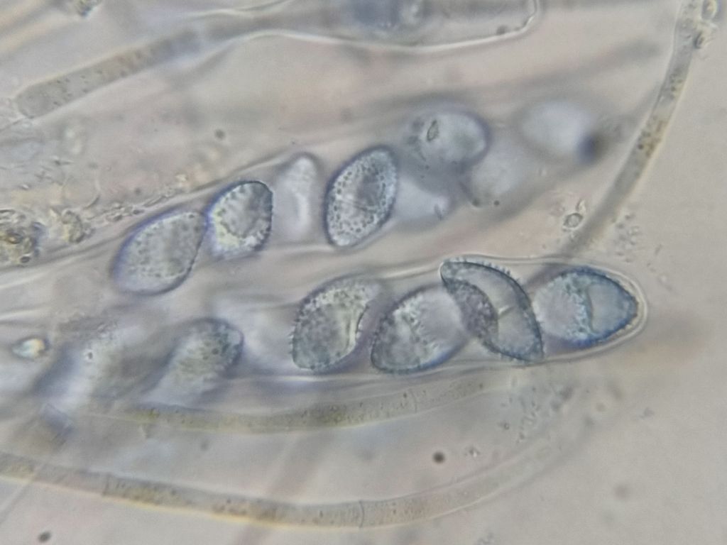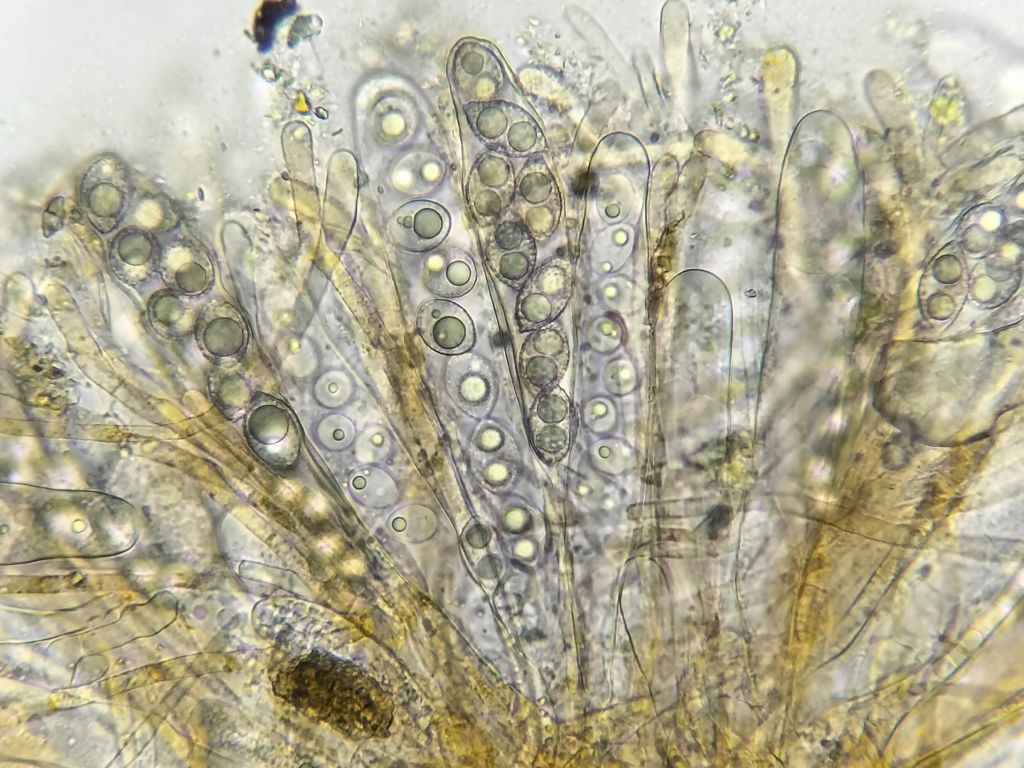Apothecium with host plants. Ashey Cemetery, VC10, England. Dec 2022Apothecia semi buried among host plants.Asci at different stages of development in water.Ascospores in cotton blue in lactic acid.Ascospores in cotton blue in lactic acid.