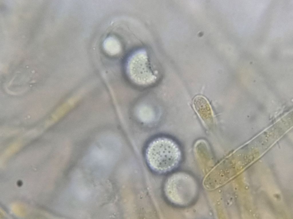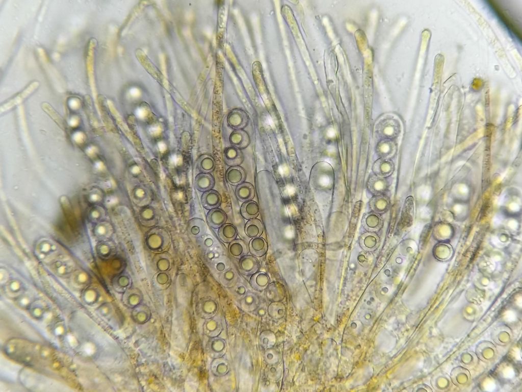 Apothecia at the edge of Amblystegium serpens on concrete. East Cowes Cemetery, VC10, Dec 2022.As above.Hymenium in water.Ascospore ornamentation after treatment in heated cotton blue in lactic acid.