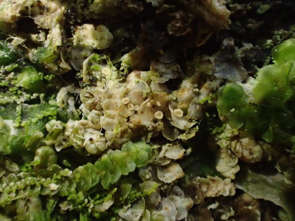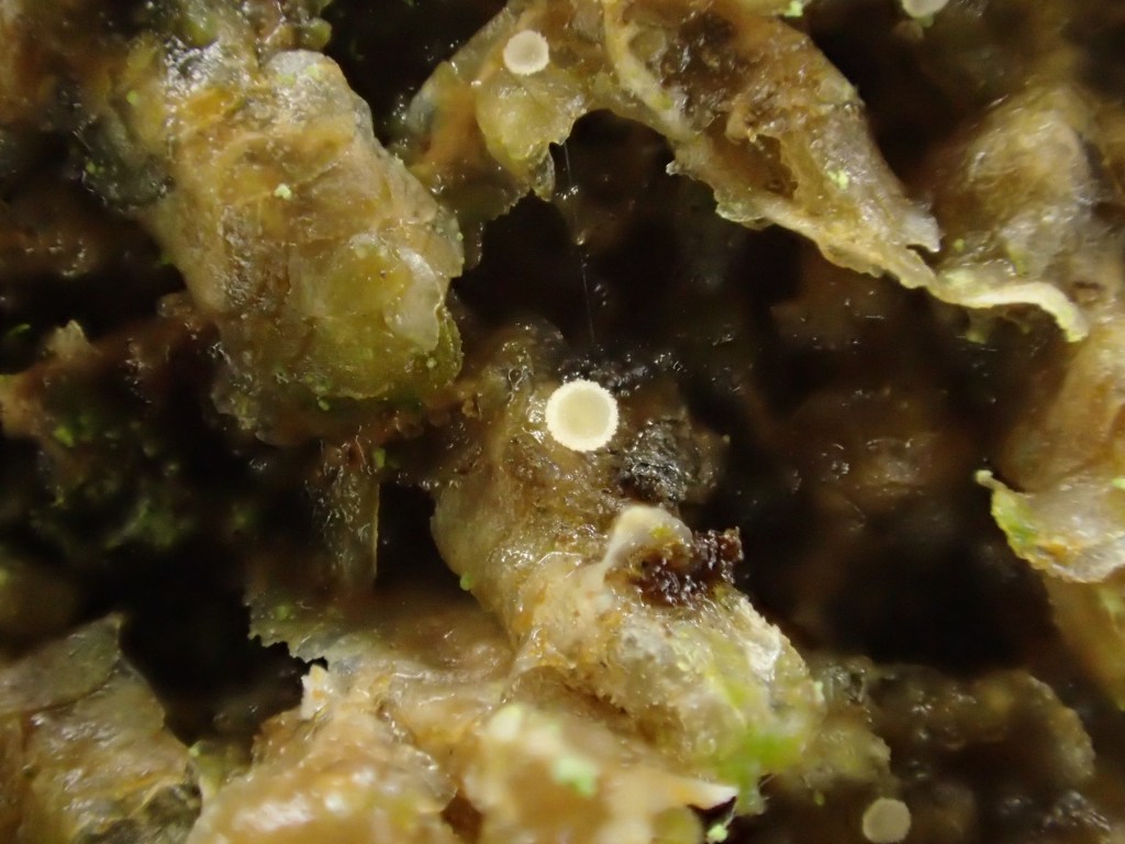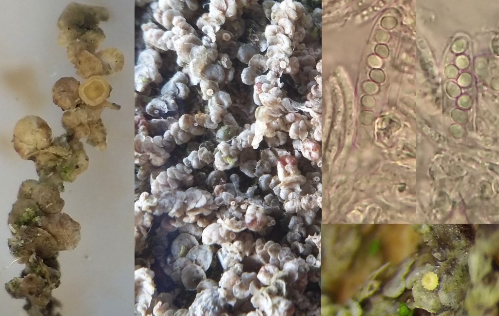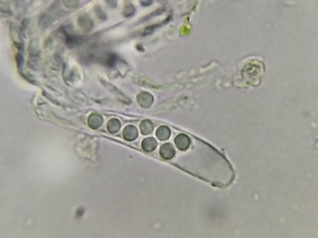 Young apothecia, Headon Warren, IoW, March 2025Expanded apothecia, near Monmouth, Feb 2025Material from Briddlesford Copse, VC10, Dec 2021Ascus containing spores in water (1000X). Material from Briddlesford Copse, VC10, Dec 2021Ascospore in cotton blue (in lactic acid) showing warted epispore.Material from Brighstone Forest, VC10, April 2018Hundreds of thousands of apothecia on host patches observed at Headon Warren wood, VC10, late Dec 2021Hundreds of apothecia on host patches observed at Headon Warren wood, VC10, late Dec 2021Another section of the above material.